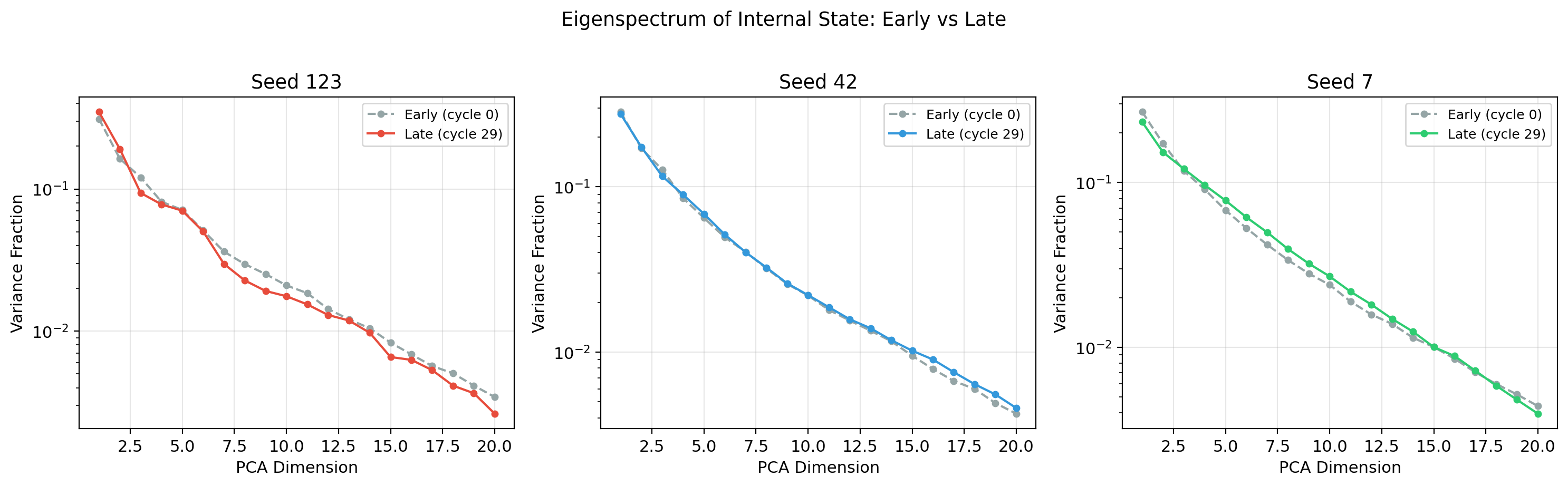 Internal state eigenspectrum, early vs late. Log-scale variance fraction by PCA dimension. Seeds 123 and 42 show the late eigenspectrum becoming more concentrated in the top components — genuine compression under evolutionary pressure. Seed 7 stays relatively flat, consistent with its lack of world-model development.