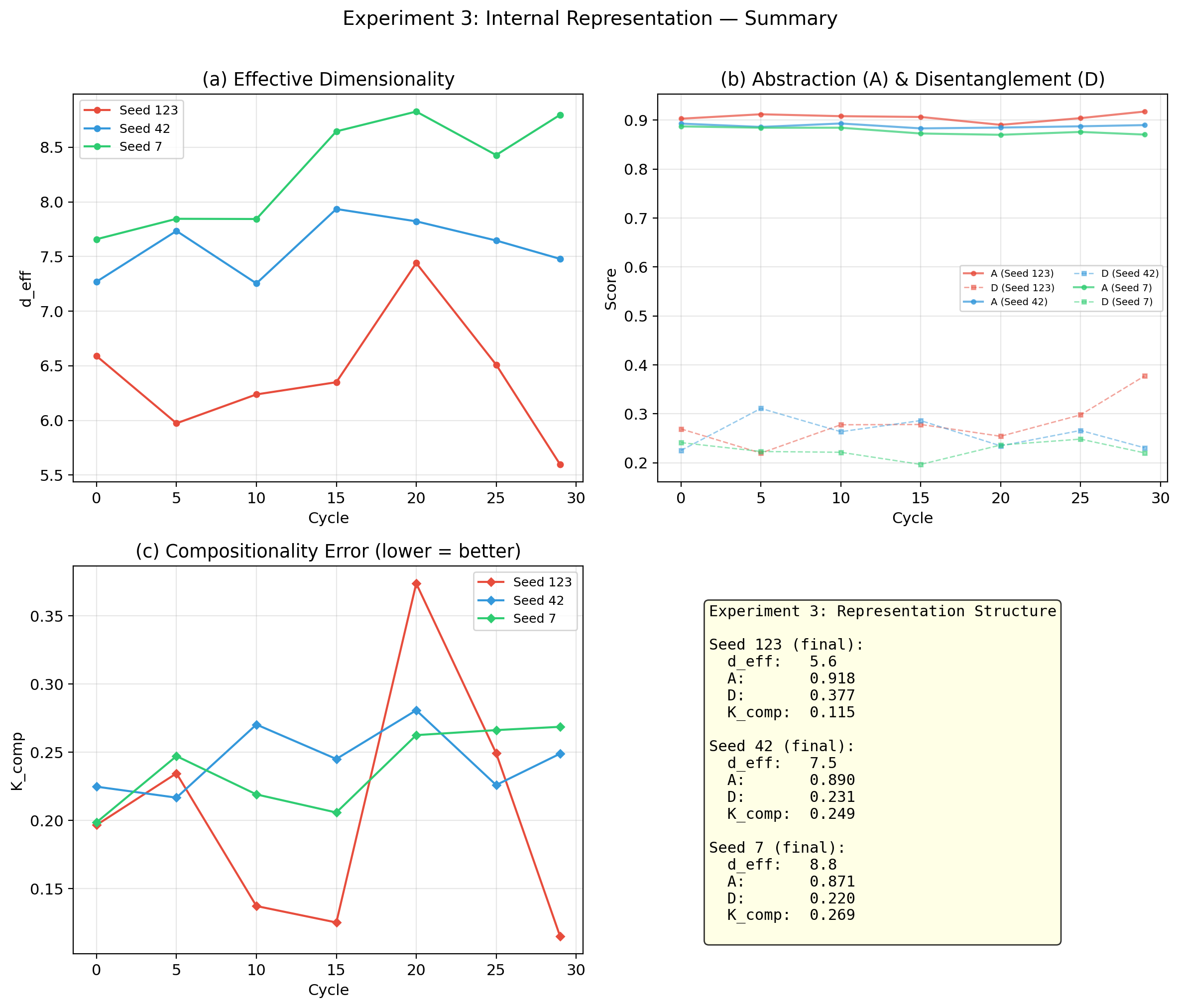 Experiment 3: Representation structure summary. (a) Effective dimensionality: 5.6–8.8 out of 68 possible — strong compression from cycle 0. Seed 123 compresses further over evolution. (b) Abstraction (A ≈ 0.89) is high and stable; disentanglement (D ≈ 0.25) remains low. The gap confirms the theory: compression is cheap but clean factoring requires agency. (c) Compositionality error — lowest for seed 123 at bottleneck, consistent with the bottleneck amplification pattern from Exp 2.