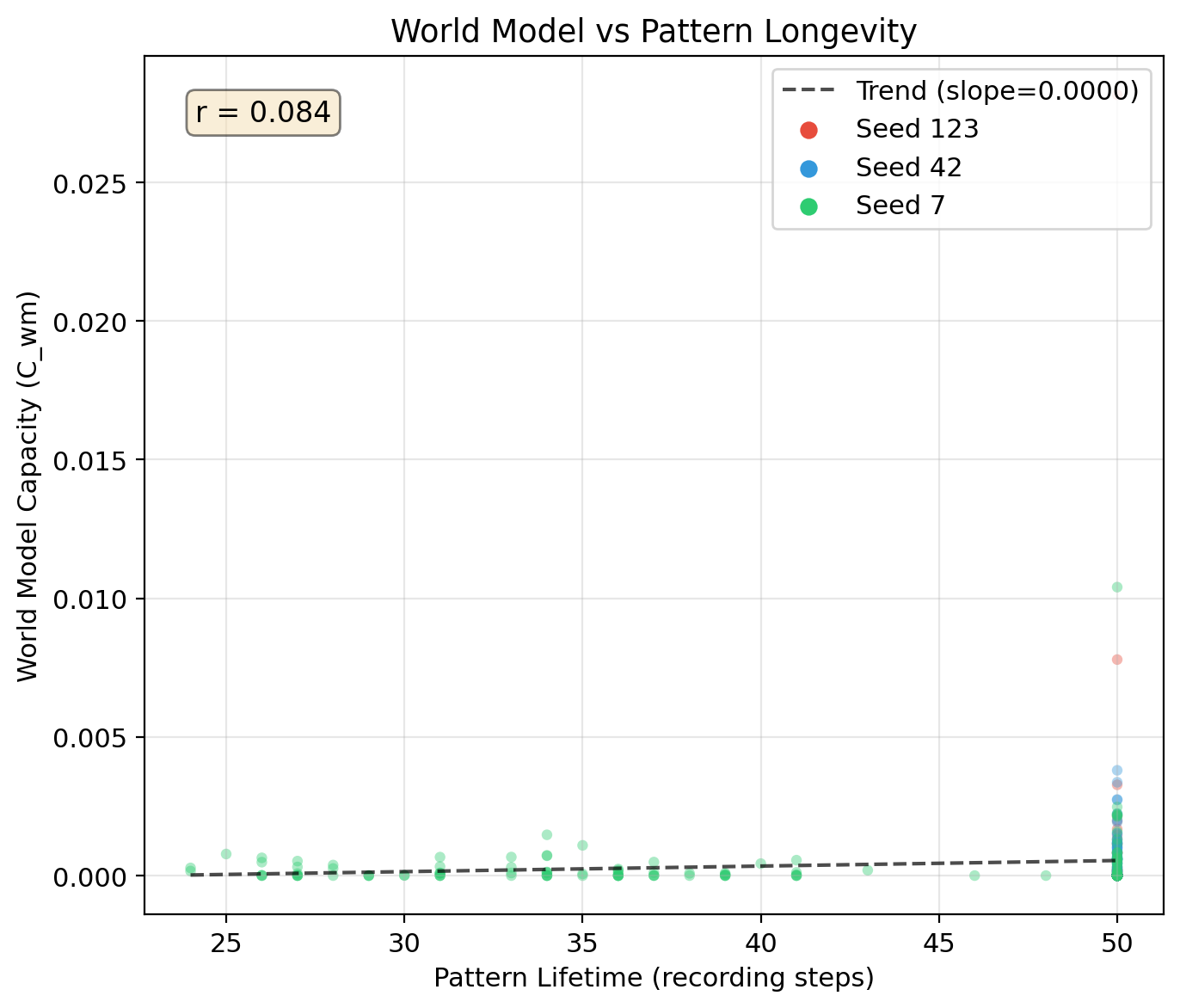 World model vs pattern longevity (r = 0.084). Near-zero correlation: having a world model does not help a pattern survive longer. Most points cluster at C_wm ≈ 0 regardless of lifetime. The few high-C_wm outliers are long-lived patterns at cycle 29 — the world model emerges as a byproduct of bottleneck survival, not as a survival advantage.