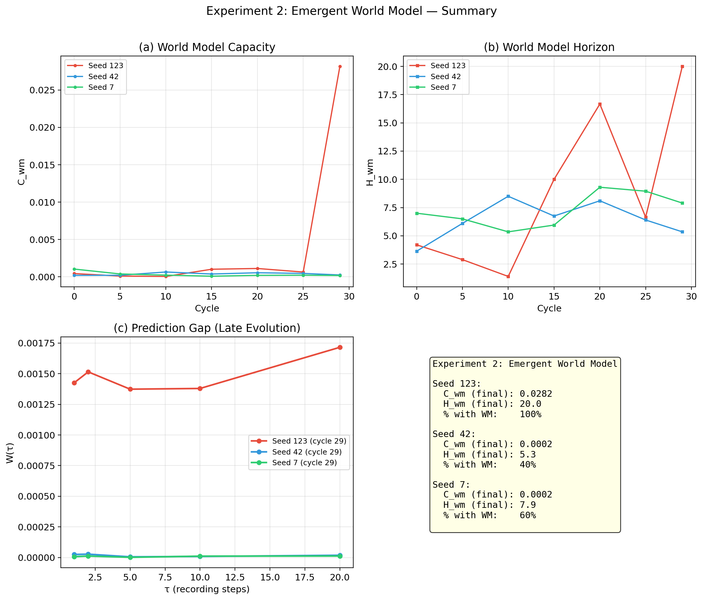 Experiment 2: World model summary. (a) World model capacity over evolution — note the y-axis scale (0.000–0.030). Seed 123 shows a dramatic late spike; seeds 42 and 7 remain near zero throughout. (b) World model horizon in recording steps. (c) Prediction gap at late evolution — seed 123 maintains a flat, elevated prediction gap across all horizons, consistent with a genuine (if weak) internal model.