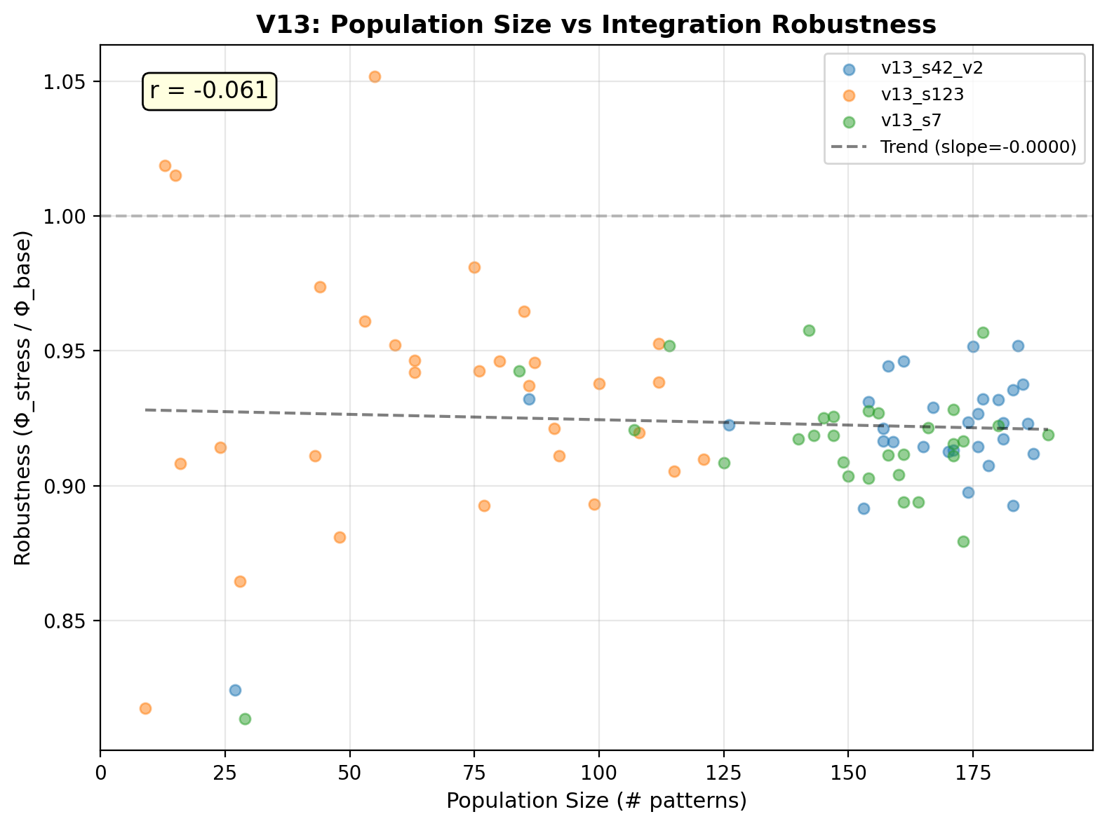 V13 evolution trajectory (seed 42). Four panels: (top-left) mean Φ under baseline and stress conditions — note the collapse to ~0 during severe bottleneck at cycle 10; (top-right) stress robustness with the proportion of patterns showing Φ increase; (bottom-left) population dynamics — the pink bands mark drought cycles with 60–100% mortality; (bottom-right) content-coupling parameters τ (similarity threshold) and β (gate steepness) drifting under selection.Cross-seed robustness trajectories. Left: individual seed trajectories (3 seeds, 30 cycles each) fluctuating around 0.90–0.95. Right: mean trajectory with ±1 SD band. Dashed lines show V11.0 baseline (−6.2%) and V11.2 heterogeneous chemistry (−3.8%) for comparison. V13 content coupling improves mean robustness but does not break the 1.0 threshold reliably.Population size vs integration robustness (r = −0.061). Each dot is one cycle from one seed. The flat trend confirms that integration robustness is a per-pattern property, not a collective emergent effect. Small populations (bottleneck survivors) occasionally show robustness above 1.0, but population size itself has no predictive power.Cross-seed summary. All 3 seeds survive 30 cycles. Mean robustness 0.923, with ~30% of cycles showing Φ increase under stress.